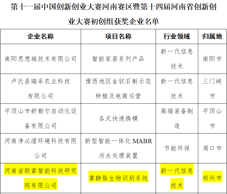 3月9日,河南省科学技术厅发布关于第十一届中国创新创业大赛河南赛区暨第十四届河南省创新创业大赛初创组获奖企业名单,联睿科技全资子公司河南省联睿智能科技研究院凭借“掌静脉生物识别系统”参赛项目荣获初创组三等奖。